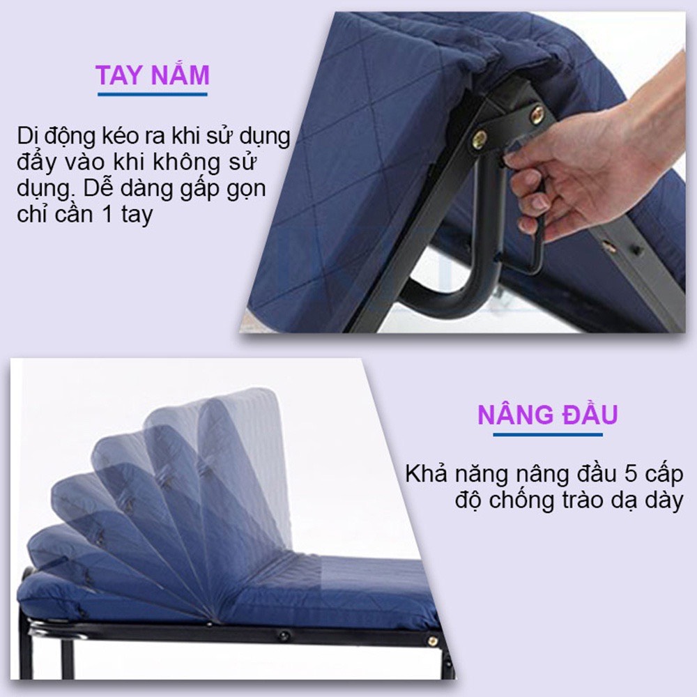 - Giường gấp có phần đầu nâng được 5 cấp khác nhau từ 0 độ đến 90 độ, bạn có thể thoải mái điều chỉnh theo sở thích và phù hợp nhu cầu sử dụng. Tính năng này rất tiện dụng trong lúc đọc sách, thư giãn hoặc bệnh nhân trong điều trị được bác sĩ chỉ định nằm cao đầu.